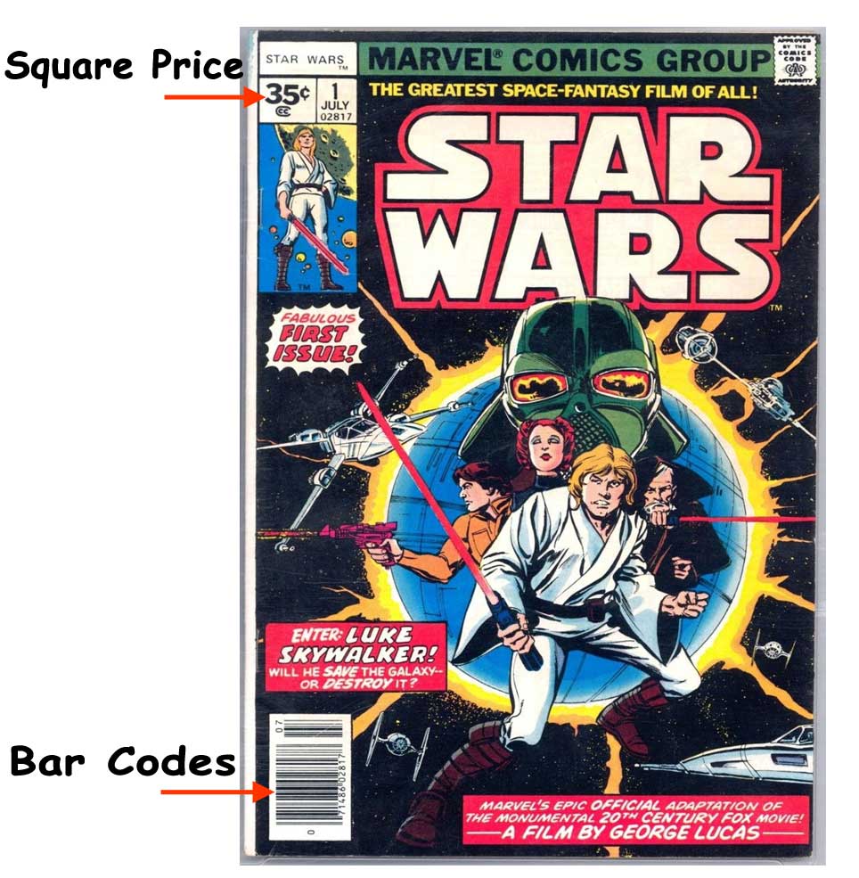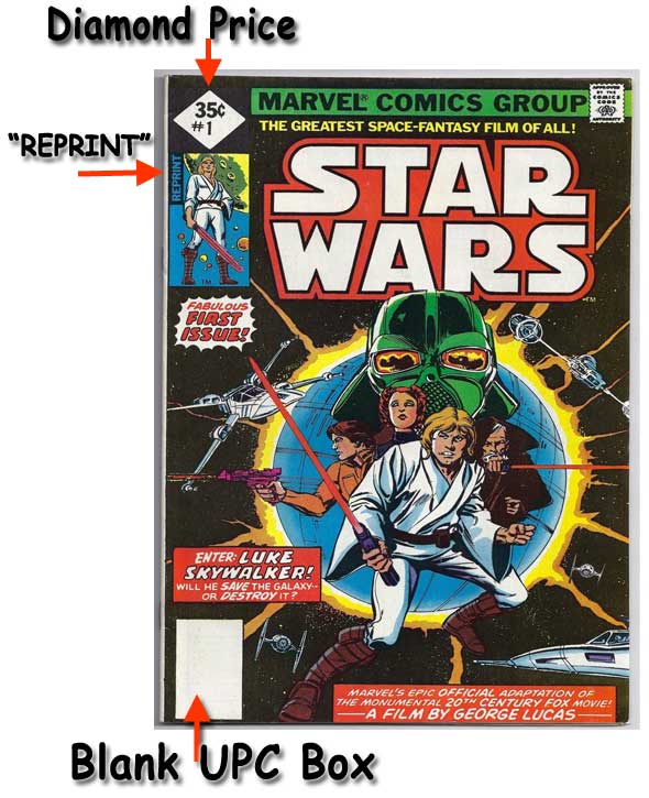 The most important piece of information you must know about the Star Wars 35 cent variant is the true variant has a bar code in the UPC square. There are copies that were distributed in 3 packs with the 35 cent price tag but the square where the UPC code should be is blank. These typically also have “REPRINT” along the upper left hand spine next to the Luke Skywalker picture. I’ve included some photo examples below.